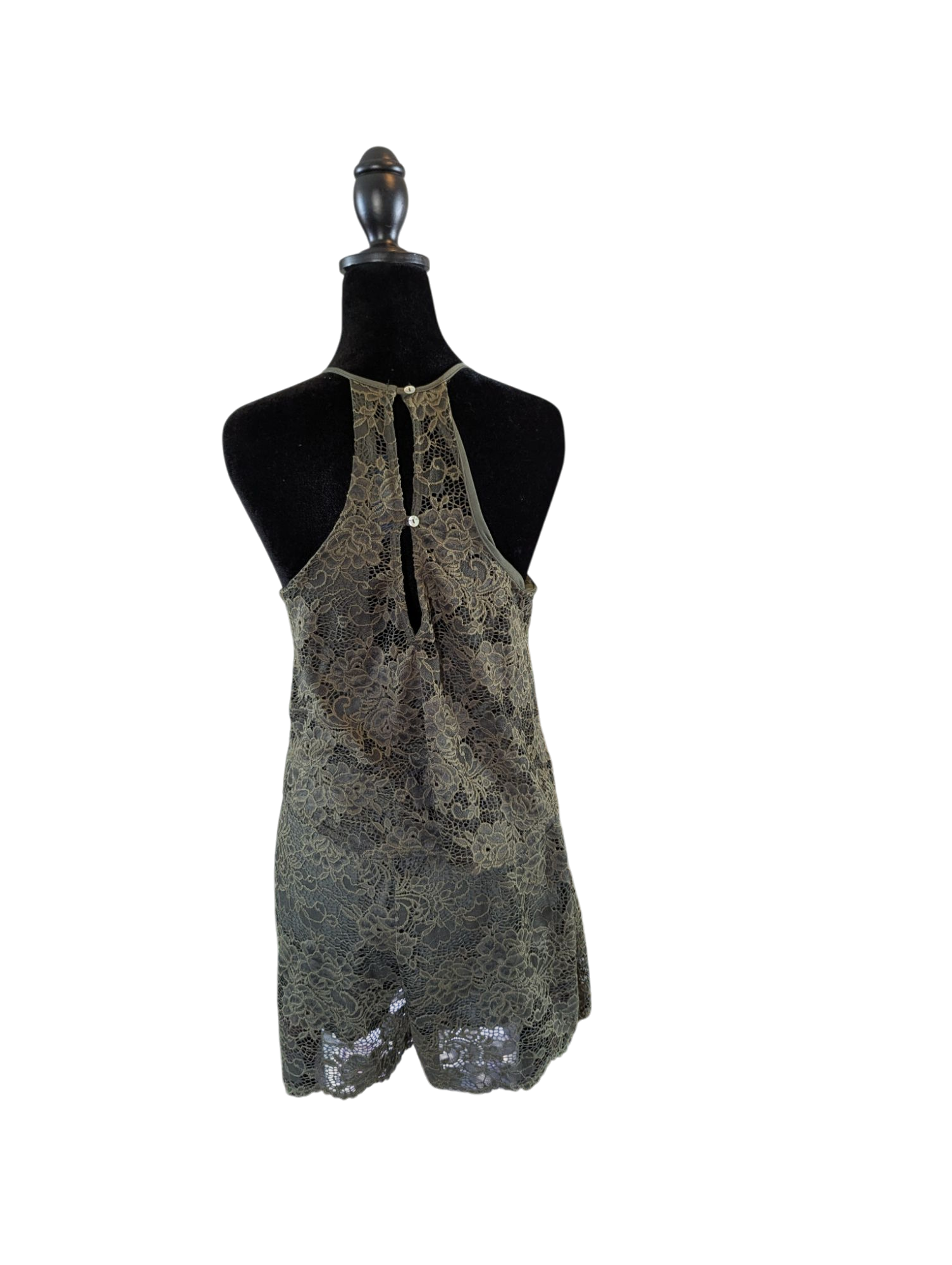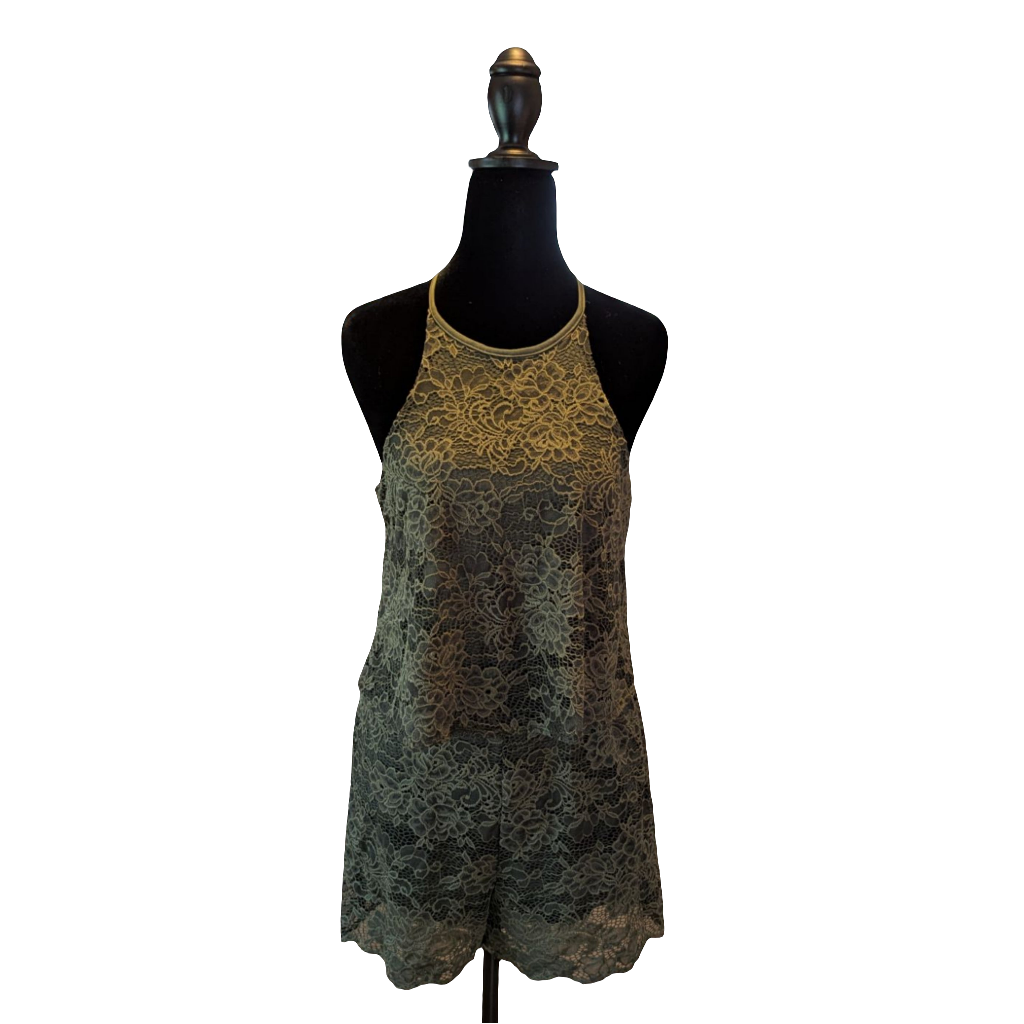 Olive Green lace shorts romper. Thrifted. Excellent condition. No loose threads or snags. Cute for a summer party or date night.