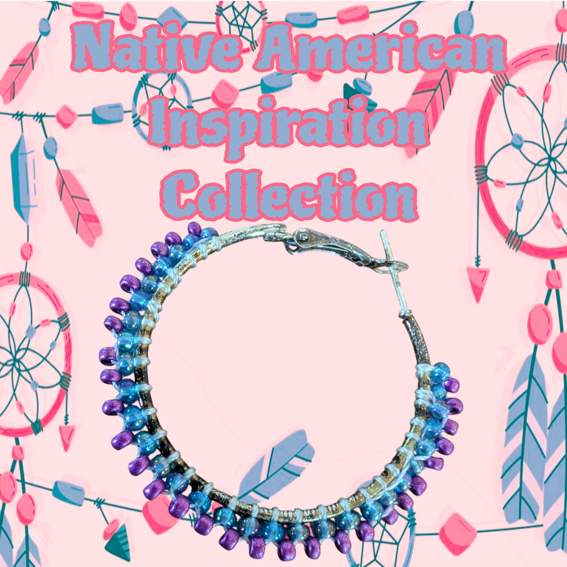 Hoop earrings are 35mm, nickel free, silver plated for hypoallergenic needs. Seed beads are blue and purple. Hand crafted.