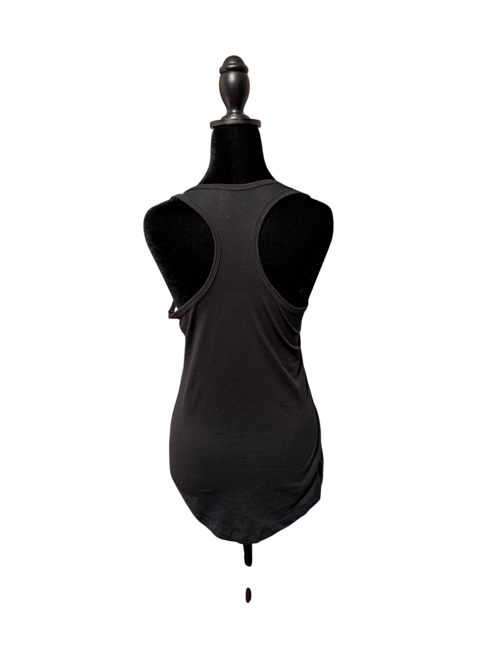 Adorable two tone racer back tank top. Fabric: Poly/Cotton blend. Size:Medium. Front is white with "Not My Problem" Razzle cat print. Back of tank top is black.