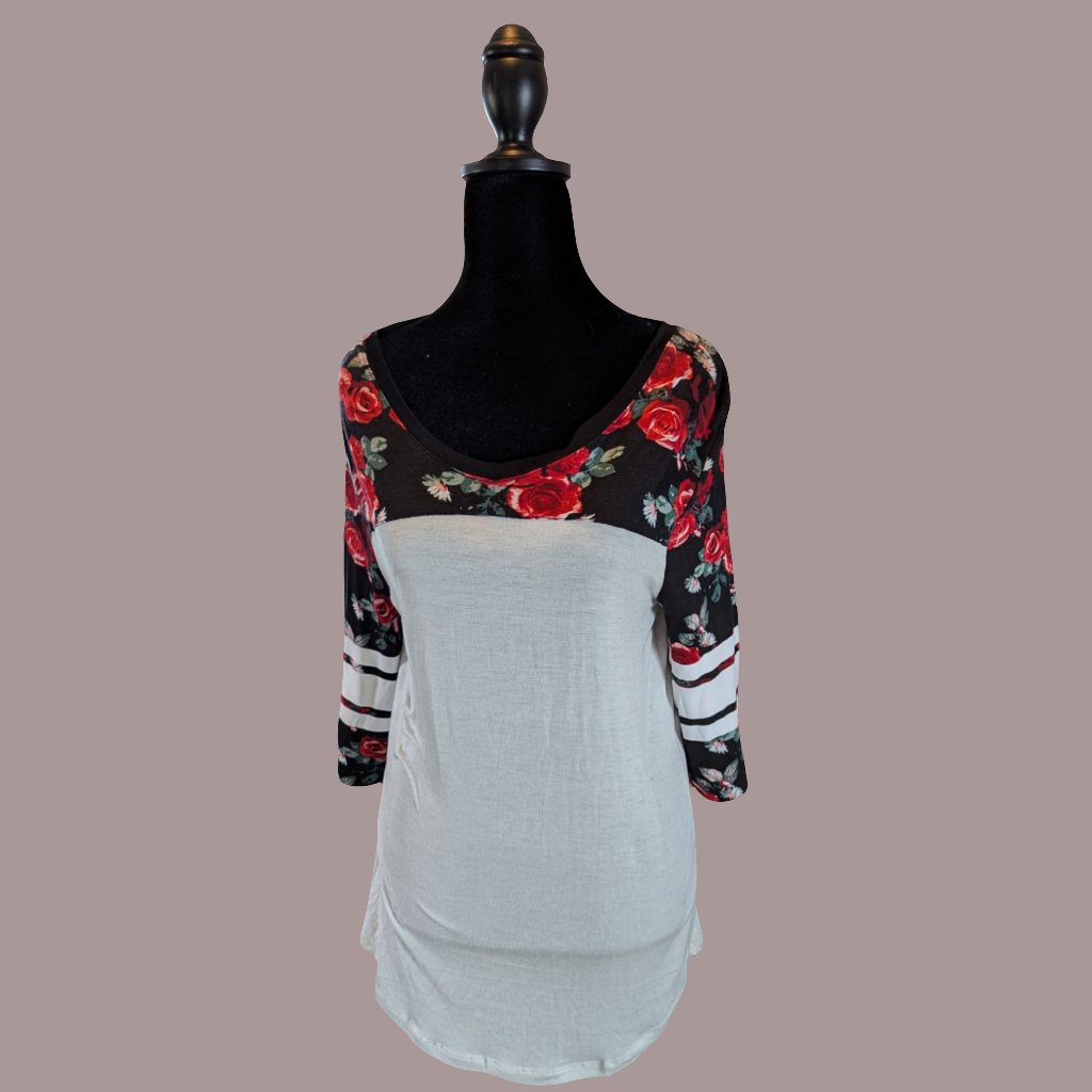 Rose print and white baseball jersey style top. Fabric is soft and comfortable.